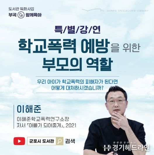 군포시는 학교폭력으로 고통받고 있는 자녀들과 부모들을 위하여 이해준 강사(이해준학교폭력연구소장)를 초청하여 부곡도서관 특화주제 ‘함께육아’ 특별강연 ‘학교폭력 예방을 위한 부모의 역할’을 운영한다.