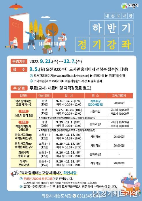 [경기헤드라인=문수철 기자] 의왕시 내손도서관은 시민들의 독서·문화생활에 활기를 불어 넣어줄 ‘2022년 하반기 정기강좌’수강생을 모집한다.