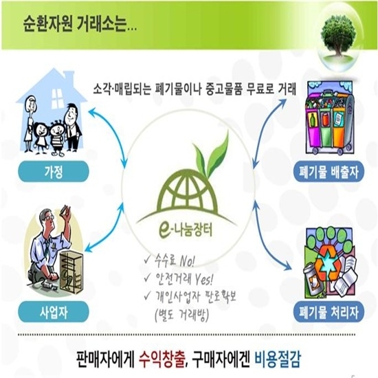 중고물품을 자유롭게 사고 팔기를 원하는 사람은 순환자원거래소 사이트(http://www.re.or.kr) 홈페이지 접속후 회원등록을 하면 누구나 자유롭게 거래가 가능하며 폐기물 거래 또한 가능하다.