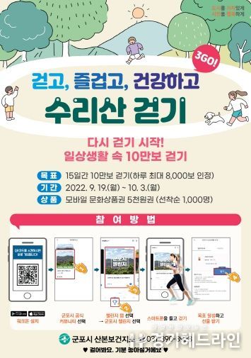 [경기헤드라인=문수철 기자] 군포시는 2022년 9월 수리산 걷기 사업을 재개하면서 9. 19.~10. 3. 15일동안 10만보 걷기 챌린지에 도전한다.