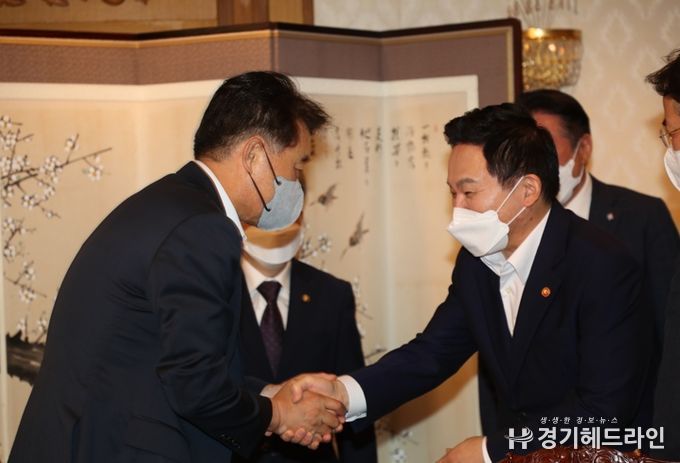 [경기헤드라인=문수철 기자] 하은호 군포시장은 8일 정부서울청사에서 원희룡 국토부 장관을 만나 1기 신도시 특별법의 조속한 제정과 용적율 완화 등을 요구했다.