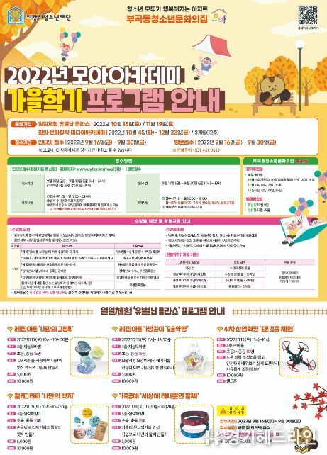 모아아카데미 가을학기는 10월 4일부터 12월 23일까지 12주간 운영되며, 수강신청은 9월 16일부터 30일까지 부곡동청소년문화의집 홈페이지 또는 부곡동청소년문화의집을 방문(화~토, 10~18시)해 선착순으로 접수 할 수 있다. 또한 일일체험 유별난 클라스는 10월 15일과 11월 19일 운영하며 레진아트, 드론체험, 캘리그라피 등 체험형 프로그램을 진행한다.