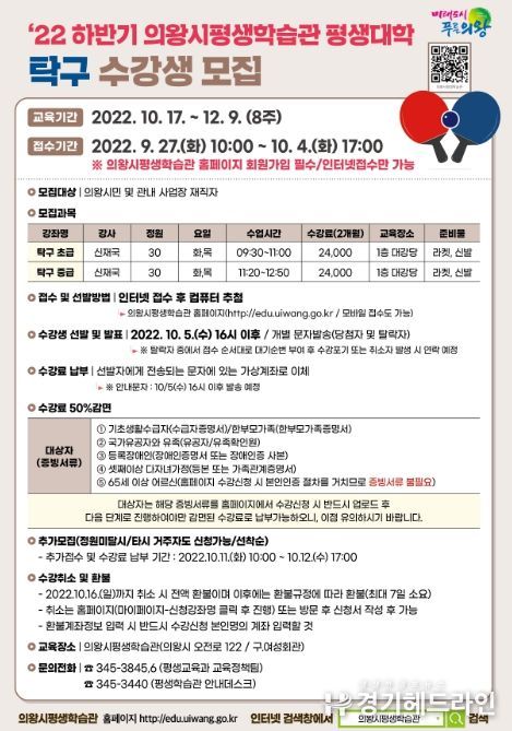 [경기헤드라인=문수철 기자] 의왕시가 오는 9월 27일부터 10월 4일까지 평생대학 탁구 강좌 수강생을 모집한다.