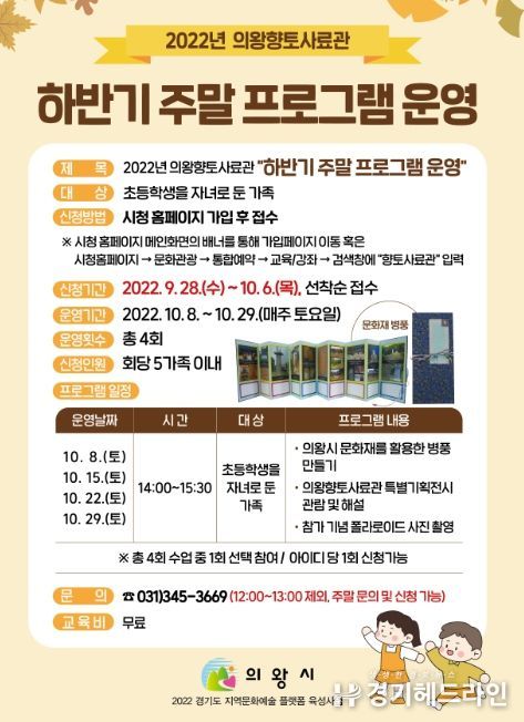 [경기헤드라인=문수철 기자] 의왕시 공립박물관 의왕향토사료관은 하반기 주말 프로그램에 참여할 가족을 오는 28일부터 선착순으로 모집한다고 밝혔다.