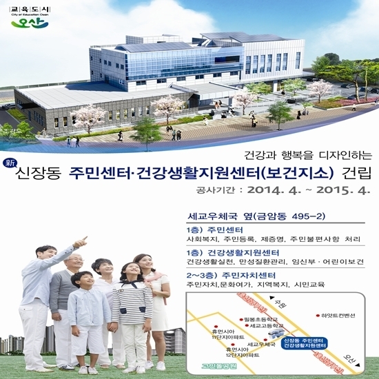 오산시 관계자는 세교우체국 옆 금암동 495-2번지상에 들어서게 될 신장동 주민센터·건강생활지원센터가 지난 4월 중순 공사에 들어가 1년간의 공사기간을 거쳐 2015년 4월 준공후 5월 청사입주 예정에 있다고 밝혔다.