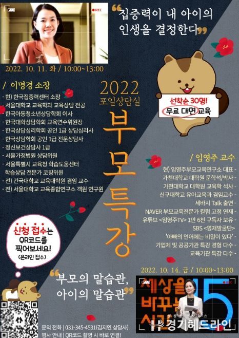 [경기헤드라인=문수철 기자] 의왕시청소년상담복지센터 포일상담실에서 ‘2022부모특강’을 수강할 참가자를 모집한다.