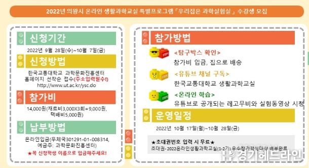 [경기헤드라인=문수철 기자] 의왕시는 과학기술에 관심 있는 어린이들을 위해 온라인 생활과학교실 ‘우리 집은 과학실험실’수강생을 10월 7일까지 모집한다.