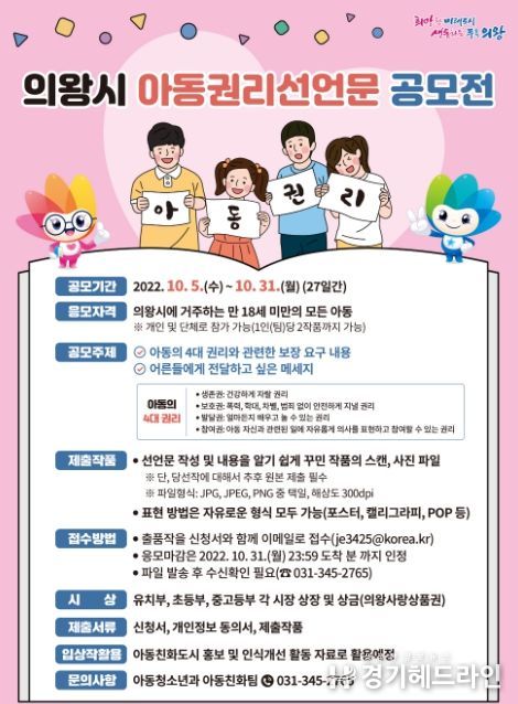 [경기헤드라인=문수철 기자] 의왕시는 아동권리 증진 및 인권 감수성 향상을 위한 ‘의왕시 아동권리선언문 공모전’을 이달 5일부터 31일까지 실시한다고 밝혔다.