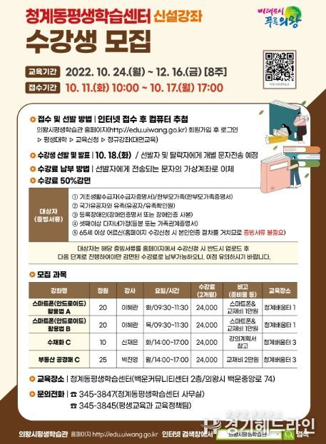 [경기헤드라인=문수철 기자] 의왕시는 오는 10월 11일부터 17일까지 청계동평생학습센터에서 평생대학 강좌 수강생을 모집한다고 밝혔다.