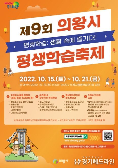 [경기헤드라인=문수철 기자] 의왕시는 오는 10월 15일부터 21일까지 6일 동안 ‘평생학습, 생활 속에 즐기다!’라는 주제로 제9회 의왕시 평생학습축제를 개최한다.