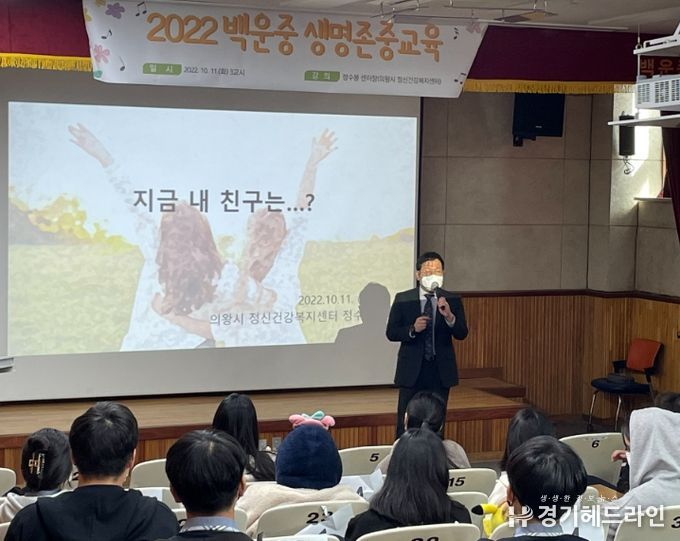 [경기헤드라인=문수철 기자] 의왕시보건소가 운영하는 정신건강복지센터는 지난 10월 11일 정신건강의 날(10월 10일)을 맞이하여 의왕시 백운중학교 전교생을 대상으로 생명존중교육“지금 내 친구는...?”이라는 주제로 강의를 진행했다.