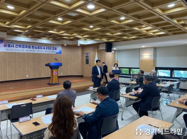 [경기헤드라인=문수철 기자] 군포시는 14일 오후 15시 시청 별관 회의실에서 조직 내 리더인 5급 이상 간부공무원 60여명을 대상으로 탄소중립 및 ESG 경영에 대한 교육을 실시했다.