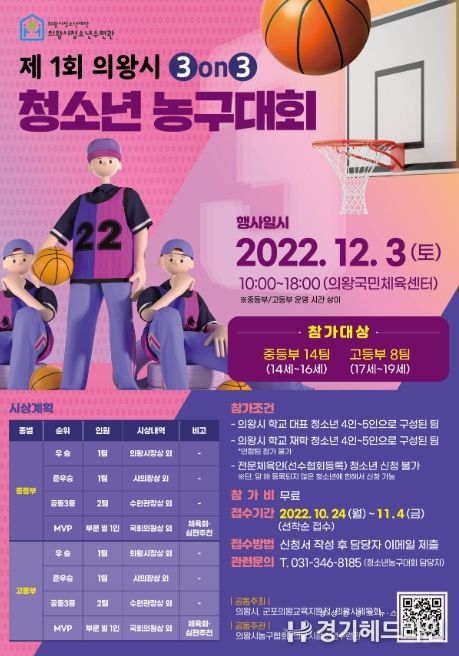 [경기헤드라인=문수철 기자] 의왕시청소년재단 의왕시청소년수련관은 12월 3일(토) 개최하는 ‘제1회 의왕시 3on3 청소년 농구대회’(이하 청소년농구대회) 참가자를 10월 24일부터 선착순 모집한다.