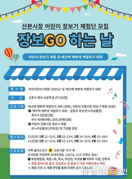 관내 초등학생을 대상으로 하는 장보기체험은 11월 5일과 6일 장보기체험과 에코백 예쁘게 색칠하기에 참가할수 있으며 10월 31일 11시부터 선착순으로 카톡플러스친구 '산본시장'을 추가후 신청할수 있다.