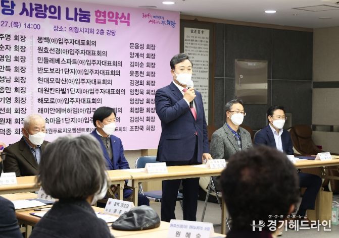 [경기헤드라인=문수철 기자] 사단법인 대한노인회 의왕시지회는 27일 노인회지회 사무실에서 관내 10개 공동주택 입주자대표회장과 1사1경로당 사랑의 나눔 협약식을 개최했다.