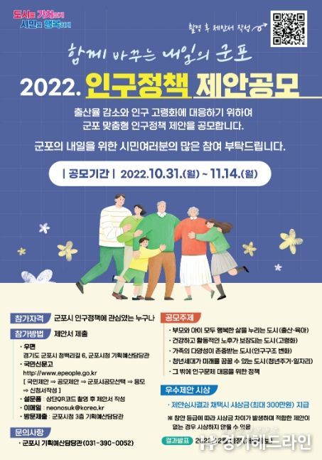 [경기헤드라인=문수철 기자] 군포시는 저출산·고령화로 인한 사회구조의 빠른 변화에 효과적으로 대응하기 위하여 오는 31일부터 인구정책 제안공모를 실시한다.