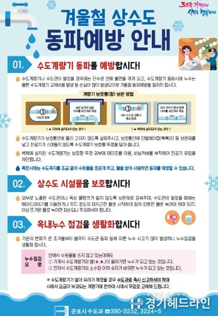[경기헤드라인=문수철 기자] 군포시는 겨울철 한파에 따른 수도시설 동파사고 예방과 신속한 긴급복구를 위해 내년 3월 중순까지 ‘2022년 겨울철 한파대비 수도시설 동파방지 대책’을 추진한다고 밝혔다.