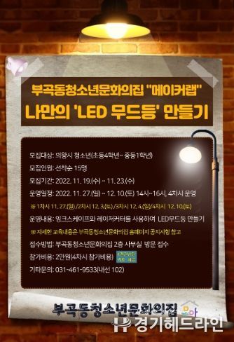[경기헤드라인=문수철 기자] (재)의왕시청소년재단 부곡동청소년문화의집에서는 초등학교 4학년 ~ 중학교 1학년을 대상으로 ‘LED 무드등 만들기’참가자 15명을 오는 19일부터 23일까지 선착순 모집한다.