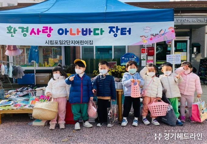 이번 성금은 시립포일2단지어린이집 원아들이 사용하지 않는 장난감이나 입지 않는 옷 등 다양한 물건들로 ‘아나바다 장터’를 운영해 마련한 수익금을 모아 동에 기탁했다..