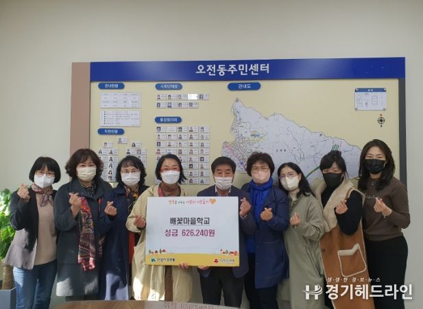 [경기헤드라인=문수철 기자] 의왕시 평생학습마을공동체 ‘배꽃피는행복학습마을학교’은 의왕시 평생교육기관(단체) 특성화 사업 추진으로 발생한 수익금 626,240원을 오전동지역사회보장협의체에 전달했다고 22일 밝혔다.