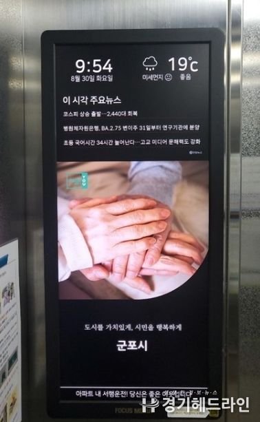 [경기헤드라인=문수철 기자] 군포시가 내년부터 공동주택 엘리베이터에 설치돼 있는 미디어보드를 통한 시정 홍보를 확대할 계획이라고 밝혔다.