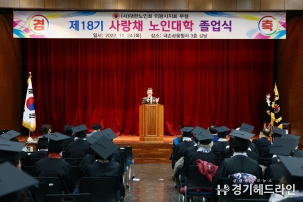 [경기헤드라인=문수철 기자] (사)대한노인회 의왕시지회(지회장 이종훈)는 지난 24일 내손공용청사 3층 대강당에서 124명의 졸업생과 내빈들을 모시고 사랑채노인대학 제18기 졸업식을 가졌다.