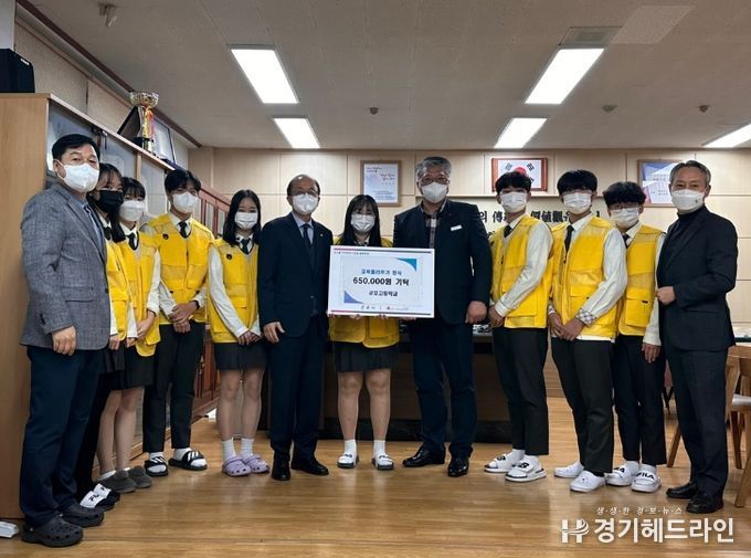 [경기헤드라인=문수철 기자] 군포고등학교 학생들이 교복 물려주기 행사를 통해 모은 수익금을 경기도사회복지공동모금회를 통해 군포시에 이웃돕기 후원금으로 전달했다.