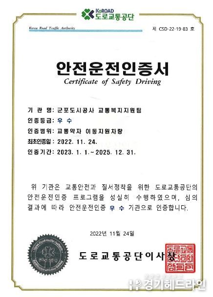 [경기헤드라인=문수철 기자] 군포도시공사(이하 공사)는 지난 11월 24일 도로교통공단이 주관하는 안전운전인증 우수기관으로 선정되어 인증을 취득했다.