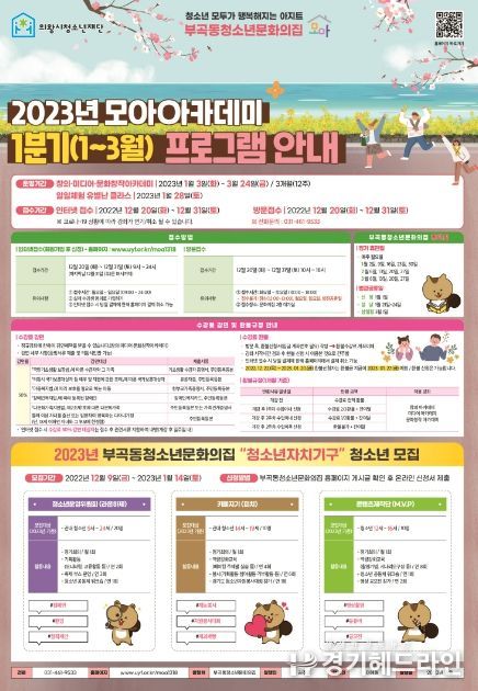 모아아카데미 1분기 프로그램은 2023년 1월 3일부터 3월 24일까지 12주간 운영되며, 수강 신청은 12월 20일부터 31일까지 부곡동청소년문화의집 홈페이지 또는 방문(화~토, 10~18시)으로 선착순 모집한다.