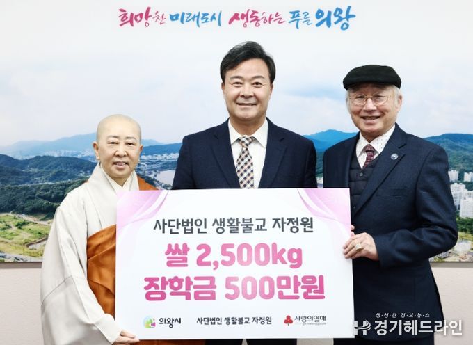 [경기헤드라인=문수철 기자] 의왕시는 지난 14일 사단법인 생활불교 자정원에서 쌀 10kg 250포와 장학금 500만원을 기부했다고 밝혔다.