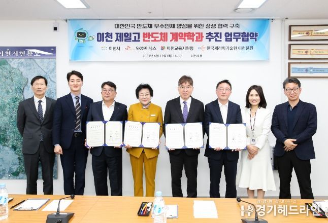 이천시는 13일 SK하이닉스, 이천교육지원청, 한국세라믹기술원과 함께 이천제일고등학교 반도체 계약학과 신설을 위한‘반도체 인재양성 업무협약’을 체결했다고 밝혔다.