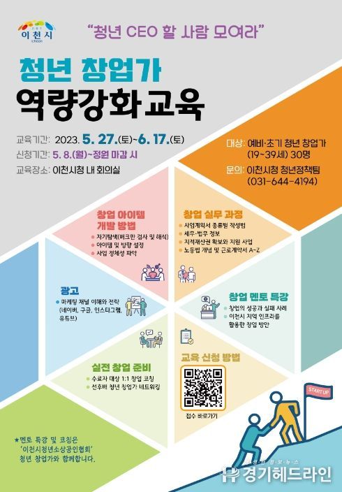 이번 교육은 이천시에 거주하거나 사업장이 소재한 19세 이상 39세 이하의 예비・초기 청년 창업가라면 누구나 참여 가능하며, 5월 8일부터 QR코드를 통해 신청하면 된다.