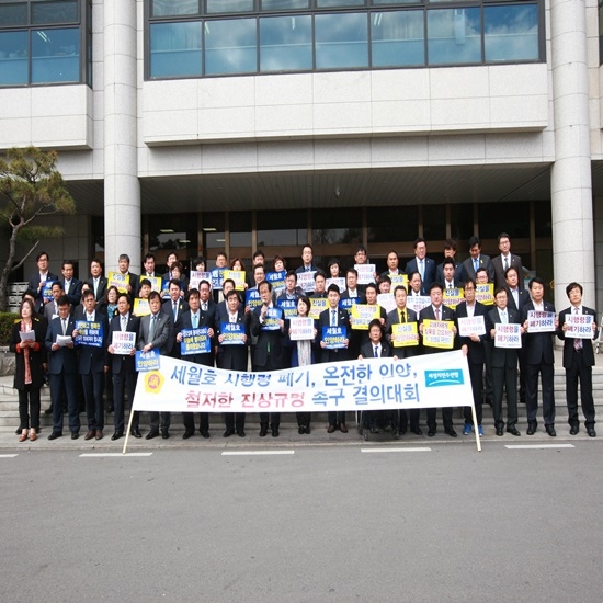 【경기헤드라인 문수철 기자】경기도의회 새정치민주연합은 오늘 본회의에 앞서 의원총회를 열고 의회 현관 계단에서 세월호 시행령안 폐기, 온전한 인양 진상규명 촉구 결의대회를 개최했다.