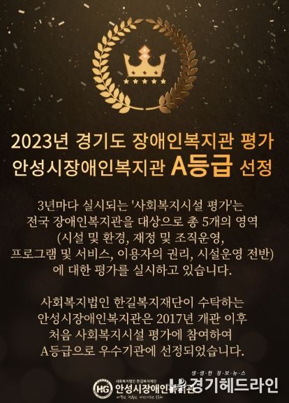 [경기헤드라인=문수철 기자] 사회복지법인 한길복지재단에서 수탁하고 있는 안성시장애인복지관은 사회복지사업법에 따라 실시한 2023년 경기도 장애인복지관 평가에서 A등급으로 우수기관에 선정됐다.
