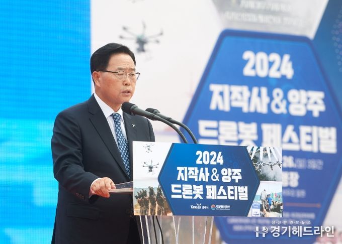 [경기헤드라인=김윤종 기자] 강수현 양주시장이 24일 오전 관내 광적면 가납리 비행장에서 개최한 ‘2024 양주시 x 지작사 드론봇 페스티벌’ 개막식에 참석해 관계자들을 격려하고 축사하고 있다.