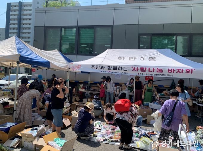 [경기헤드라인=문수철 기자] 광명시 하안3동 나눔누리터는 지난 13일 하안3동 행정복지센터 주차장에서 ‘사랑나눔 바자회’를 개최했다.