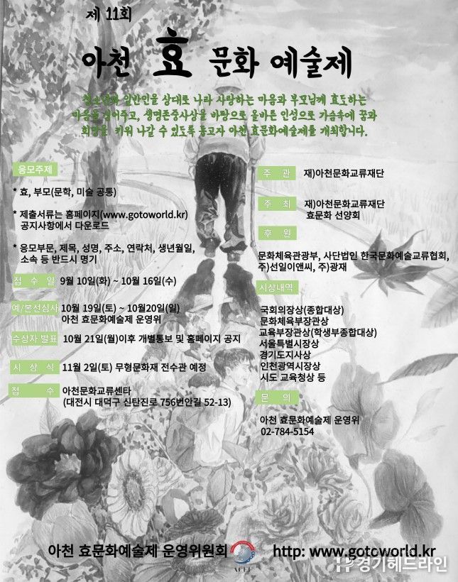[경기헤드라인=문수철 기자] 효(孝)의 새로운 가치 구현과 비전 제시를 위한 제11회 아천 효문화예술제'가 미술, 문학 공모전 및 대면 행사로 국악대회(민요, 판소리, 가야금병창)가 열린다.