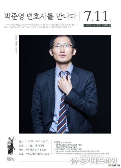 [경기헤드라인=김윤종 기자] 파주 한울도서관은 7월 11일 저녁 7시 어린이자료실에서 영화 '재심'의 실제 인물로 잘 알려진 박준영 변호사의 초청 강연을 운영한다.