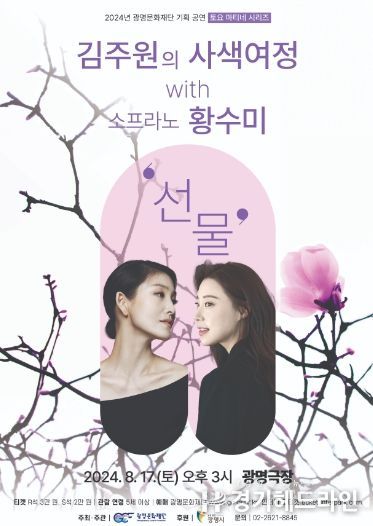 [경기헤드라인=문수철 기자] (재)광명문화재단은 2024년 토요 마티네 시리즈 '김주원의 사색여정 with 소프라노 황수미 ‘선물’' 공연을 오는 8월 17일 오후 3시 광명극장에서 선보인다.