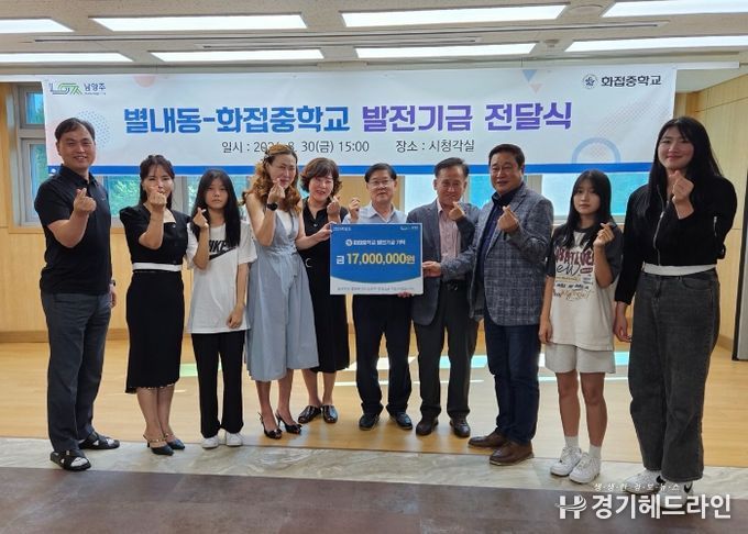[경기헤드라인=문수철 기자] 남양주시 별내행정복지센터는 30일 별내동 후원인들이 화접중학교 발전기금 1,700만원을 기탁했다고 밝혔다.