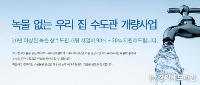 [경기헤드라인=문수철 기자] 하남시가 노후주택의 급수관 교체 등의 비용 일부를 지원하는 ‘노후 상수도관 개량 지원사업’ 참여 세대를 오는 12월 20일까지 선착순 모집한다.