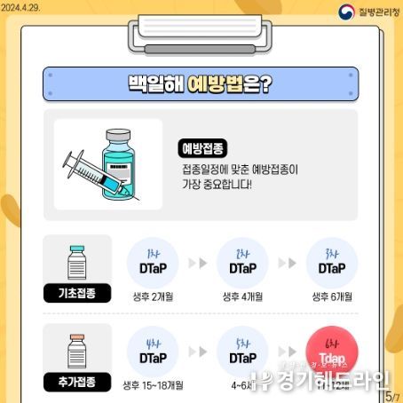 시는 백일해 예방을 위해 △2개월 △4개월 △6개월 △15~18개월 △4~6세 △11~12세 총 6회에 걸친 적기 접종을 권장하고 있다.