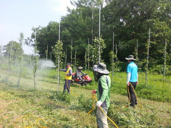 이번 사과과원에 반점낙엽병, 외래해충 선녀벌레에 침투성 이행성 작물보호제를 활용하고 농작업을 생력화 하기 위해 농기계임대사업소에 보유중인 승용 제초기계를 임대 제초작업을 실시 했다.