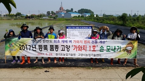 이날 실시된 손 모내기는 ‘가와지1호’의 생육 및 특성조사를 위해 시험계통·대비 품종 9품종을 1,460㎡ 면적에 식재했다. 이외에도 올해 고양시 관내 7ha의 논에 ‘가와지1호’를 재배할 계획이다.