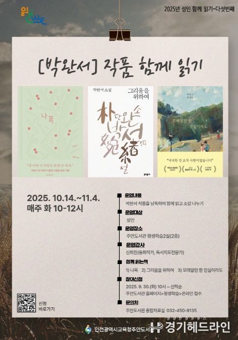 [경기헤드라인=문수철 기자] 인천광역시교육청주안도서관은 10월 14일부터 11월 4일까지 운영하는 ‘2025년 성인 함께 읽기-'박완서 작품 함께 읽기'’ 프로그램 참여자를 모집한다.