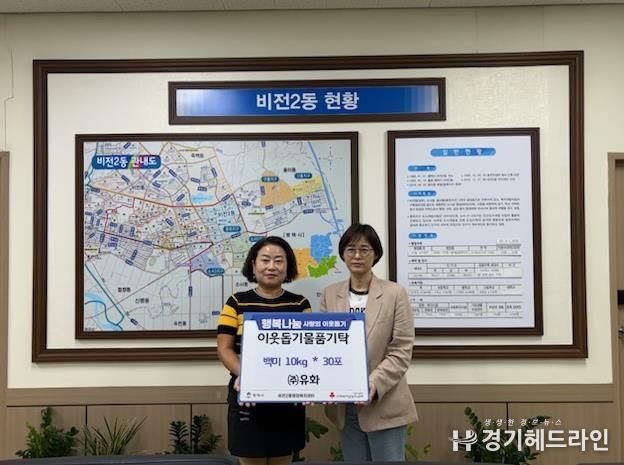 [경기헤드라인=문수철 기자] ㈜유화는 추석 명절을 맞아 지난 29일 비전2동 행정복지센터를 방문하여 100만원 상당의 백미 30포를 전달하며 온정을 베풀었다.