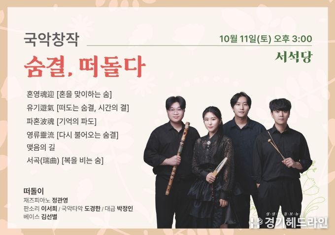 [경기헤드라인=정현수 기자] 광주문화재단(대표이사 노희용) 전통문화관은 오는 10월 11일 오후 3시, 토요 상설공연 22회차로 퓨전국악 단체 떠돌이의 '숨결, 떠돌다' 무대를 선보인다.