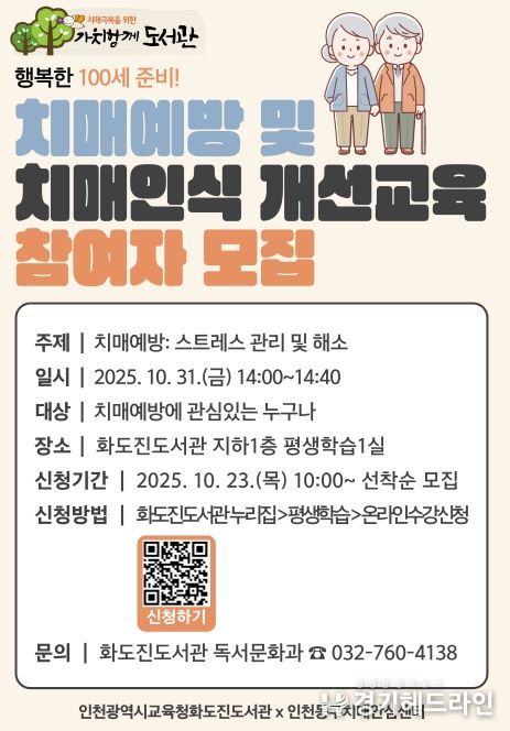 [경기헤드라인=문수철 기자] 인천광역시교육청화도진도서관은 오는 10월 31일 금요일 오후 2시에 평생학습1실에서 치매예방 및 치매인식개선 교육을 진행한다.