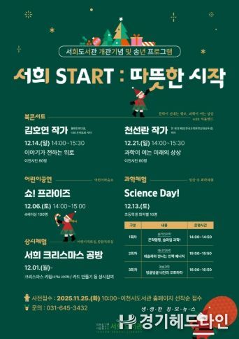[경기헤드라인=정현수 기자] 이천시 서희도서관은 개관을 기념하고 한 해를 마무리하는 송년 행사로, 시민들과 함께하는 문화예술과학 프로그램인 ‘서희 START : 따뜻한 시작’을 12월 한 달간 운영한다고 밝혔다.