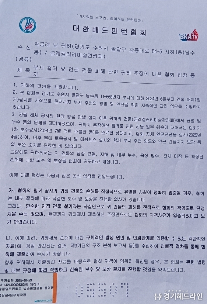 [경기헤드라인=문수철 기자] 대한배드민턴협회가 경기도 수원시 팔달구에서 진행한 건물 철거 과정에서 인접 건물에 심각한 피해를 입히고도 1년 이상 보상을 미루면서 논란이 커지고 있다.